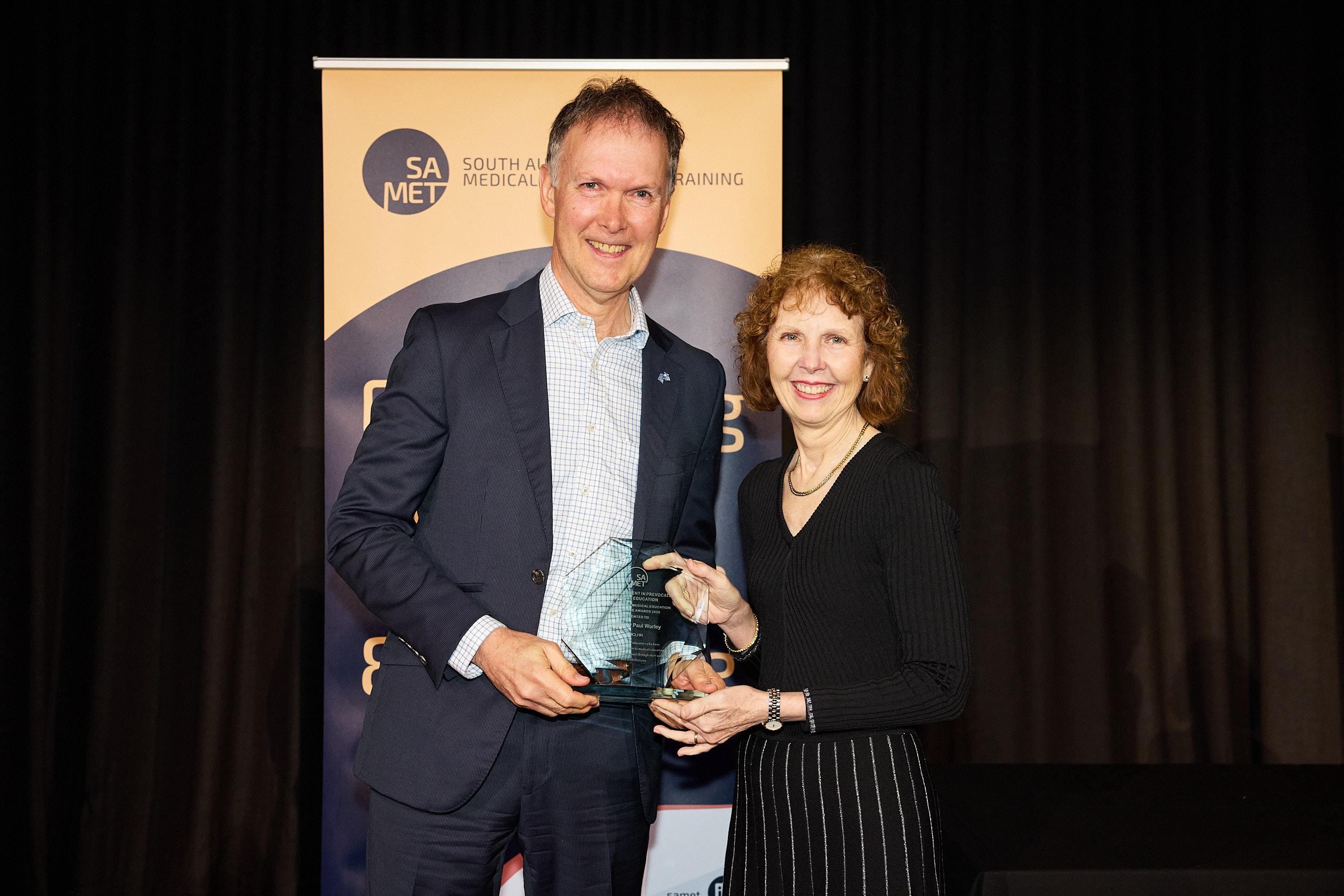 Professor Paul Worley, Riverland Mallee Coorong Local Health Network, accepting his award from Dr Robyn Lawrence, Chief Executive for Health and Wellbeing.